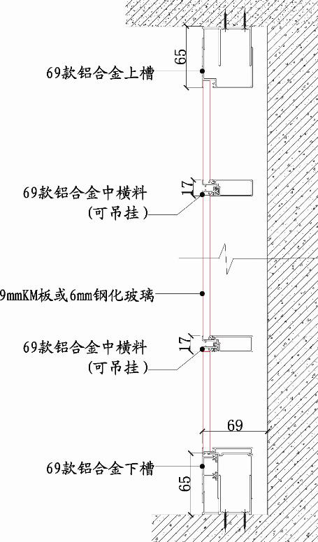 69款单面隔墙相关数据参数大致如下:69款单面隔墙壁槽用6908侧柱收边,侧柱厚度为:15mm,上槽为:55mm,下槽为:65mm,横压条为:17mm,竖压条为:13mm。
