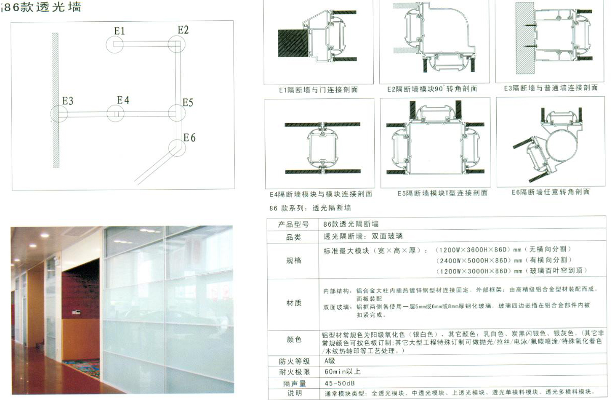 1、单玻隔墙采用钢化磨边的12mm玻璃;当采用12mm双面贴板材时,需控制好规格,宽度≤600mm。
