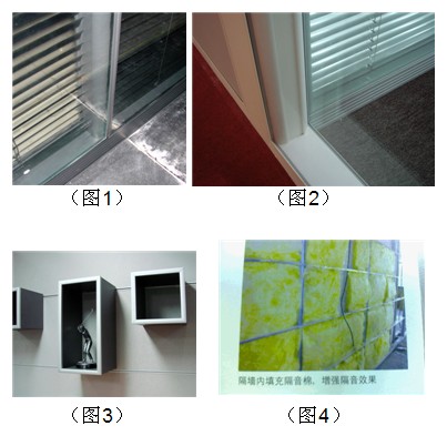 材料说明:炭黑色铝框、6mm钢化清玻、百叶帘、木纹饰面板
