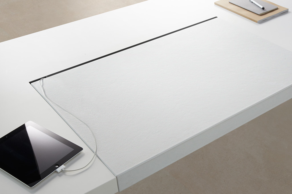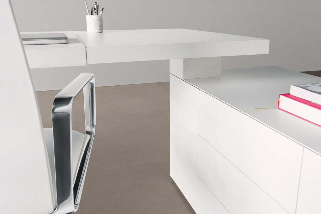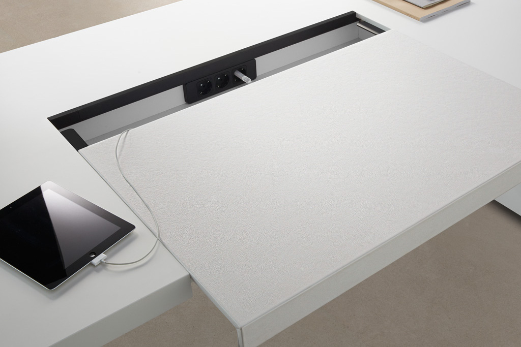 桌面和侧面,水平和垂直形成一个均匀的结构,是Headoffice Mono系列会议项目设计团队所执行的结构概念。强大的线条与精选材料的优雅相结合。由侧面和桌面所制成的直角,中间的桌子上有醒目皮革包裹的面板,如果有需要,可以使用滑动皮板来打开集成线路。电缆布线隐藏在桌面和副柜之间。