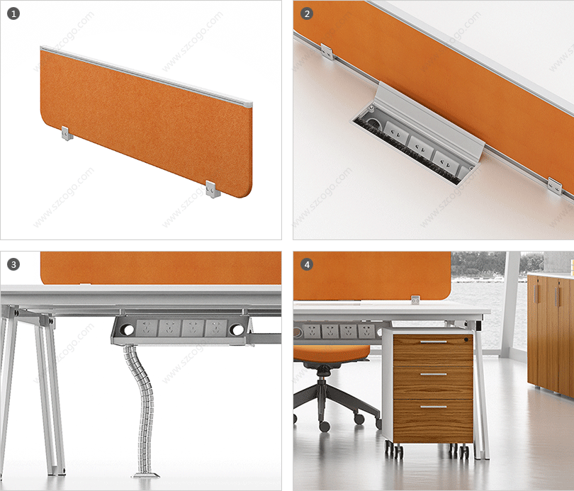 1、钢制脚架,实用高端大气;        2、整齐划一、人性方便的桌面铝合金过线系统。
