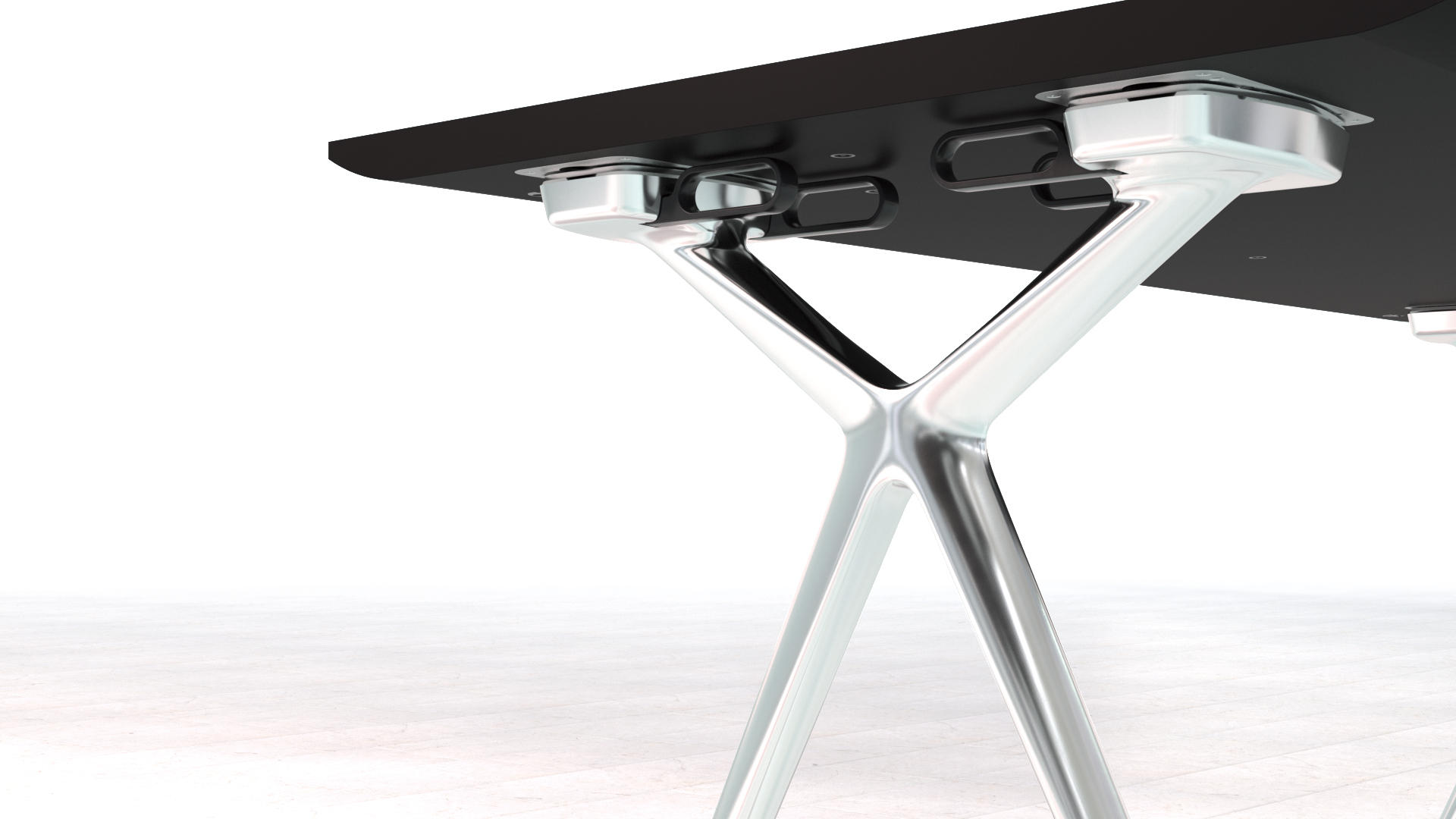 这款Conference-X最大的亮点就是:桌子腿是可以将两个桌面一起快速而轻松地结合在一起,而不需要借助任何工具。而这个专利技术的的连接关键是:桌子腿顶部处在固定锁,桌底有锁扣,以此保证绝对安全和稳定。这也很好的解决了会议台的多样性:从个人的工作桌到成排的会议桌,桌子形状、大小、都可以通过脚架来进行拼接.
