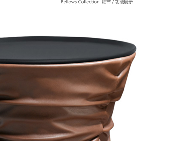 创新的设计源于对不寻常的想法进行塑造的勇气。Bellows Collection系列就是一个例子,凳子和桌子的设计令人眼前一亮,并达到了我们的预期。柔软的皮革褶皱的包裹在坚固的框架上。褶皱程度随着它的高度而改变。用一个最简单的动作,便可以利用隐藏于座椅下的环形扳机进行高度调节。