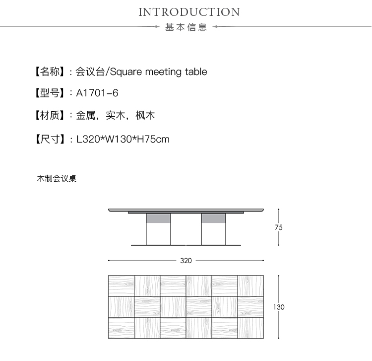会议桌。顶部饰有镶嵌工艺的几何图案,与木纹的方向一致,并由顶部镶嵌的微妙轮廓框起。中央支脚由一个方形金属柱固定在镀有抛光不锈钢的铝制底座上。表面处理:顶部镶嵌两种不同木材的镶嵌工艺。微纹理漆中的平方柱。亚光不锈钢底板。