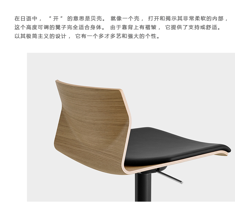 在日语中,“KAI”的意思是贝壳。就像一个壳,打开和揭示其非常柔软的内部,这个高度可调的凳子完全适合身体。由于靠背上有褶皱,它提供了支持或舒适。以其极简主义的设计,它有一个多才多艺和强大的个性。