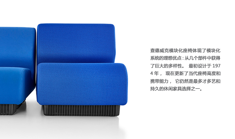 查德威克模块化座椅体现了模块化系统的理想优点:从几个部件中获得了巨大的多样性。最初设计于1974年,现在更新了当代座椅高度和携带能力,它仍然是最多才多艺和持久的休闲家具选择之一。