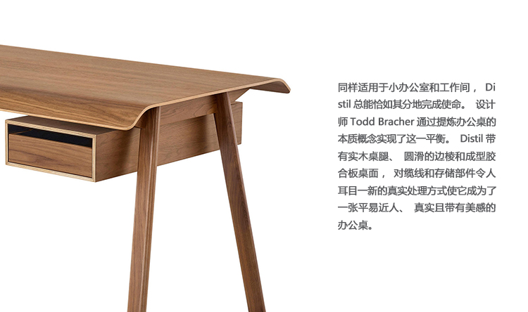 同样适用于小办公室和工作间,Distil总能恰如其分地完成使命。设计师Todd Bracher通过提炼办公桌的本质概念实现了这一平衡。Distil带有实木桌腿、圆滑的边棱和成型胶合板桌面,对缆线和存储部件令人耳目一新的真实处理方式使它成为了一张平易近人、真实且带有美感的办公桌。