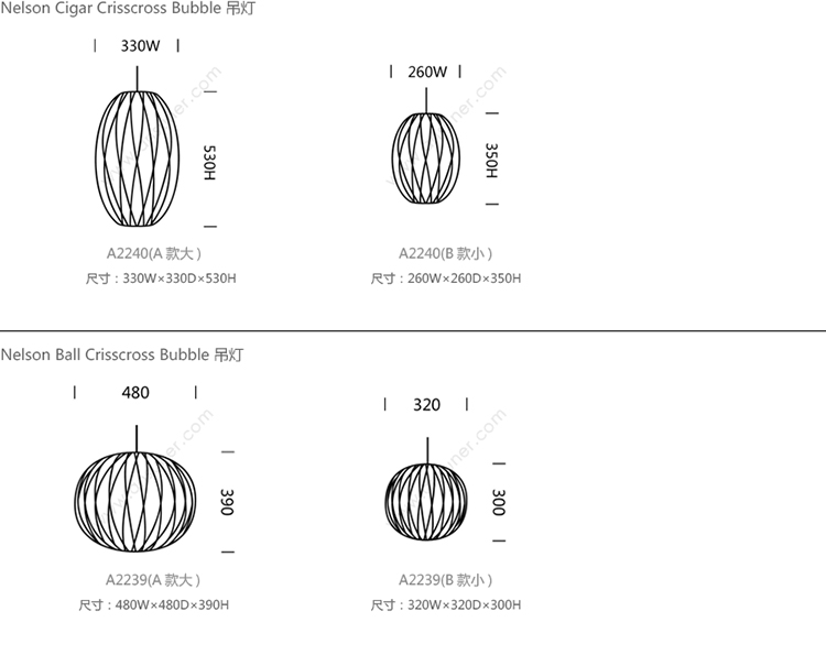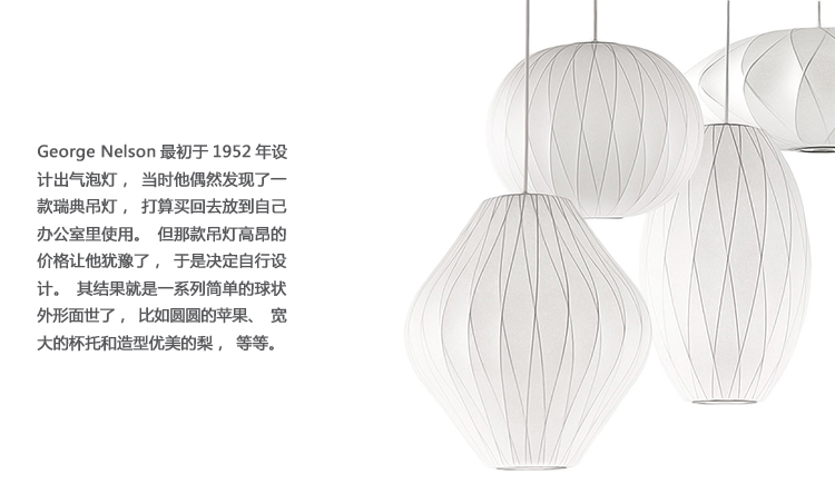 Nelson Cigar Crisscross Bubble Pendant雪茄形十字气泡吊灯可提供两种尺寸,与不锈钢吊线板配套,通过一根6英寸的吊绳悬挂在天花板上。George Nelson最初于1952年设计出气泡灯,当时他偶然发现了一款瑞典吊灯,打算买回去放到自己办公室里使用。但那款吊灯高昂的价格让他犹豫了,于是决定自行设计。其结果就是一系列简单的球状外形面世了,比如圆圆的苹果、宽大的杯托和造型优美的梨,等等。