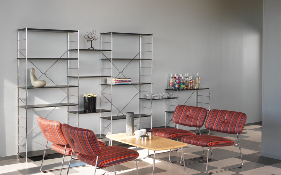 可叠放的沙发和带扶手的沙发。带软垫扶手的沙发不可叠放。木和钢制的框架。用织物或皮革覆盖的CMHR聚氨酯模压泡沫填充物。“绿色”铬合金钢制框架,铬III。塑料英尺。
