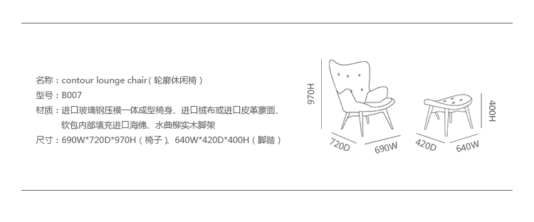 Contour系列家具由著名设计师Grant Featherston设计的,包括Contour Lounge Chair(轮廓休闲椅),Contour Lounge Ottoman(轮廓休闲脚踏)及其组合Contour Lounge Chair and Ottoman(轮廓休闲椅&脚踏)。Grant Featherston是澳洲设计界的灯塔,对许多澳洲设计师及家具控来说,Grant Featherston就是他们毕生的偶像。Contour系列家具有着花朵般的轮廓,工艺精湛榫楔结构的后倾脚座,细致钉扣从背靠延伸到坐面,超级舒适的包覆乘坐感,坐在其上面,真的就像是被捧在手心般的感觉。不论是乡村风、北欧风甚至是新古典低调奢华的家居风格,其都能像个公主般,优雅的点缀出您与众不同的品味。这把椅子经常被认为是澳大利亚家具设计的图标。灵感来自艺术与手工艺运动和包豪斯设计的极简主义的体现。