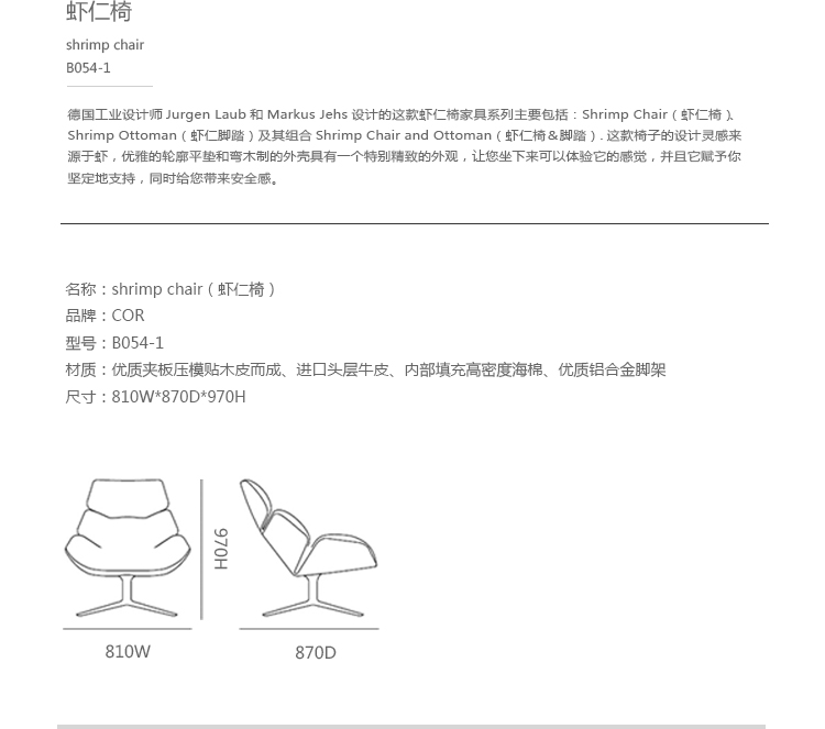 德国设计师Markus Jehs和Jurgen Laub设计的这款虾仁椅家具系列主要包括:Shrimp Chair(虾仁椅)、Shrimp Ottoman(虾仁脚踏)及其组合Shrimp Chair and Ottoman(虾仁椅&脚踏)。这款椅子的设计灵感来源于虾,优雅的轮廓平垫和弯木制的外壳具有一个特别精致的外观,让您坐下来可以体验它的感觉,并且它赋予你坚定的支持,同时给您带来安全感.