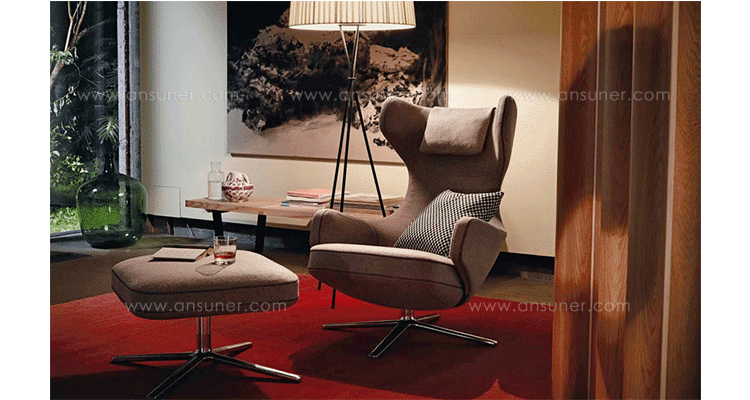 grand repos lounge chair and ottoman(grand repos 休闲椅&脚踏)由设计大师Antonio Citterio所设计的独特的,绝无仅有的休闲椅系列,椅子的创作面临的挑战如同伊姆斯夫妇当初设计著名的伊姆斯休闲椅一样,但正因如此,才能成为绝世经典。grand repos系列休闲椅采用钢制铝合金脚架、聚氨酯海绵填充、高级布艺扪面,可随意调整坐姿和高度,也可以放平躺,配上舒适的羽毛衬垫,无论阅读或者休憩,都非常舒服,符合人体工学,高档舒适,是办公,会议的理想选择。意大利设计师和建筑师 Antonio Citterio赋予了这边椅子永恒的优雅气质与无与伦比的舒适,是当代设计的经典,无论用在办公、商业、家庭都是非常高贵大气的。