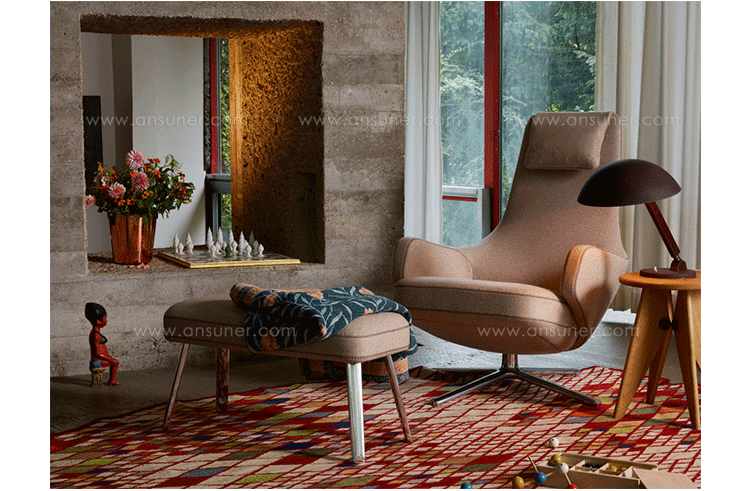 repos lounge chair and ottoman(repos休闲椅&脚踏)由设计大师Antonio Citterio所设计。repos系列休闲椅采用钢制铝合金脚架、聚氨酯海绵填充、高级布艺扪面,可随意调整坐姿和高度,也可以放平躺,配上舒适的羽毛衬垫,无论阅读或者休憩,都非常舒服,符合人体工学,高档舒适,是办公,会议的理想选择。意大利设计师和建筑师 Antonio Citterio赋予了这边椅子永恒的优雅气质与无与伦比的舒适,是当代设计的经典,无论用在办公、商业、家庭都是非常高贵大气的。