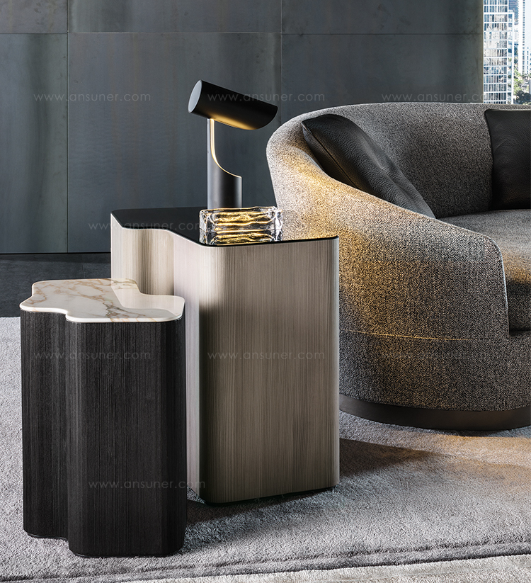 Lou边几组合拥有各种尺寸和饰面,呈现别具一格的家居风格。边几的做工极为繁琐,将现代技术与传统家具工艺完美结合在一起。内部结构为MDF材质,采用落叶松木胶合板饰面,然后在弯曲部分加以精心打磨。