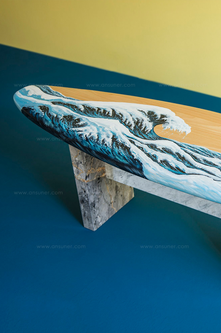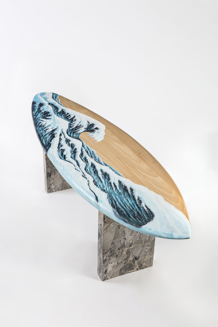 这条长凳的设计理念是:即使固定在固定的地方,也要不断移动。它结合了手工制作的石灰木和对比鲜明的大理石腿。座位是手绘的,让人想起神奈川的巨浪。