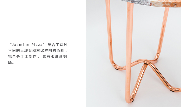 “Jasmine Pizza(茉莉花披萨)”结合了两种不同的大理石和对比鲜明的色彩,完全是手工制作,饰有弧形形铜腿。 “Jasmine Pizza”有不同的大理石,腿部饰面和尺码。