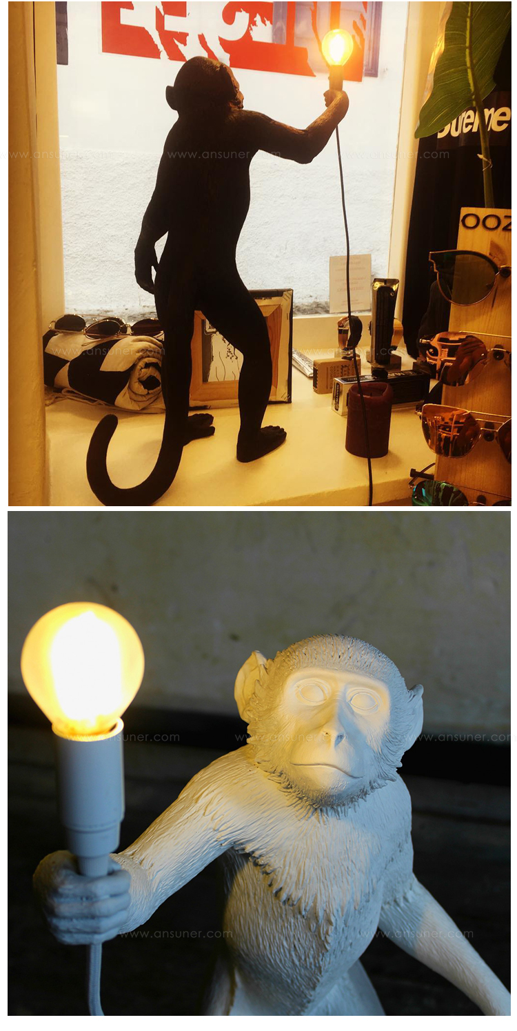 这款猴灯由树脂制成,手工完成,描绘了一只猴子在三个不同的位置,一边抓着一个LED灯泡,一边探索周围的环境,一种新的、替代的照明方式。