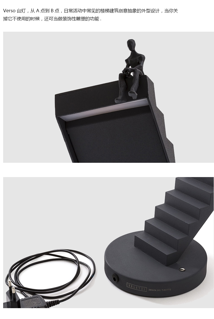 Verso台灯,它的设计目的是使一个普通的技术对象戏剧化,并在灯关闭时提供一种功能,这就是雕塑。“从A点到B点,空间中的日常活动被最著名的建筑建筑工具——楼梯所吸引。就像在建筑中一样,Verso的光线也发生了同样的事情,被送到合适的高度来照亮平原。如果点B不是唯一的目的地呢?