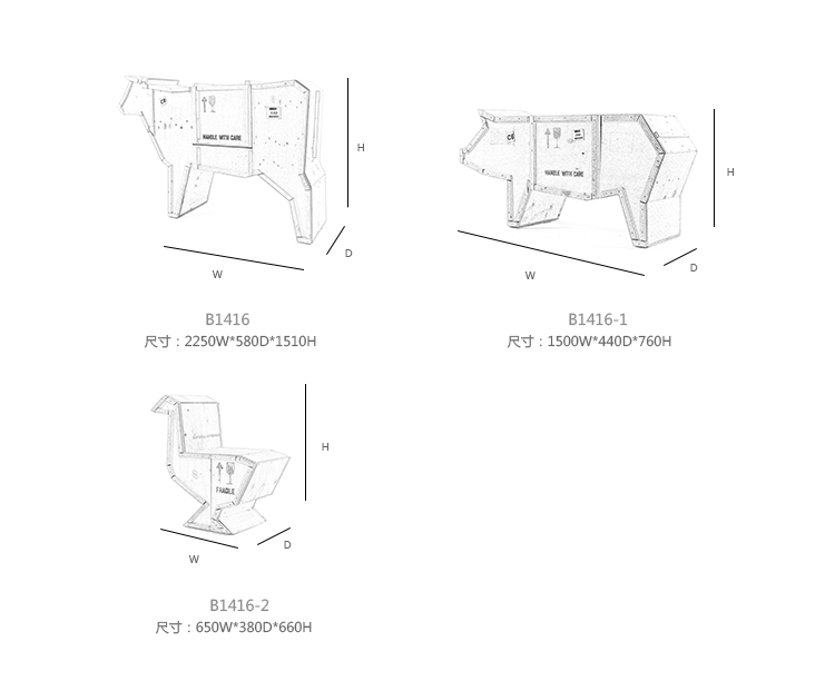 讽刺是一件严肃的事情,如果在微笑的同时让我们思考。动物板条箱协会很有趣,但同时也让我们对人类与自然的关系感到敏感。这件家具作品代表了一种荒谬的形象,动物们被运来运去。可能吗?为了更好地表达这个概念,我们选择了三种典型的农场动物,一头牛,一头猪和一只鸭子。每一个可见的瑕疵都是这件作品的特色,为了尊重原作的诗意,这些作品都是用同样的工艺制作而成,用于真正的运输板条箱。