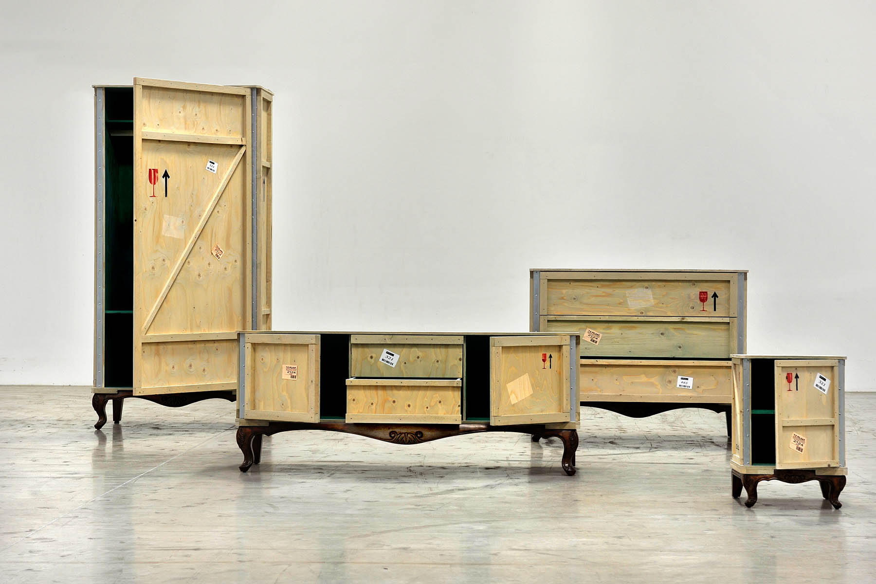 这款现代床头柜由Marcantonio Raimondi Malerba为Seletti设计,它融合了两种不同风格的设计。一个标有各种标签和标志的包装盒配上华丽的路易十四腿。明亮的绿色内部有一个架子和两个存储空间。手工制作的实木,这出口科莫床头柜是令人印象深刻的耐用性,因为它是在其独特的设计。它可以单独使用,在卧室或与来自ExportComo系列的其他家具一起创建一个焦点。意大利制造。