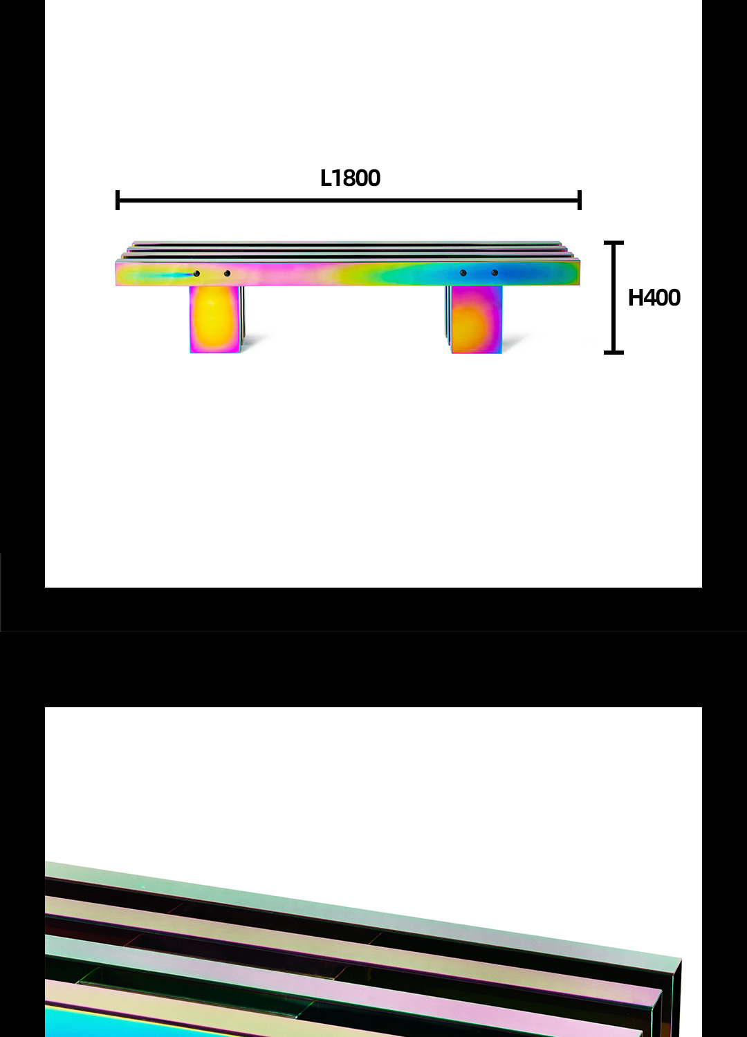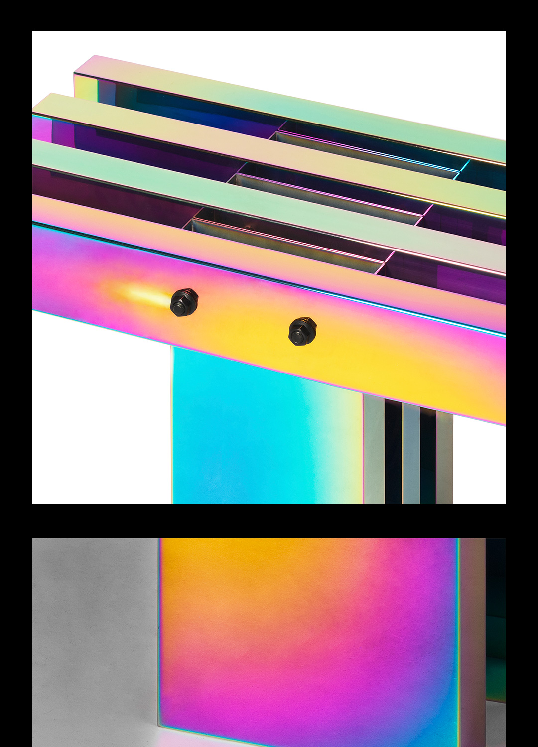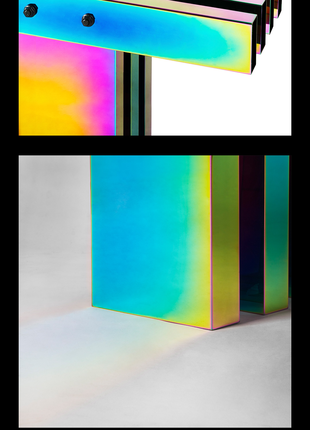 剧烈迷幻至热至冷的撞色,不遗漏任一可见光的波段,色相在连续折面上像热象图解析呈现。 镜面反射,形体纵横正立间增加色相交叠变化,与环境投射的光或影相互如实反馈。