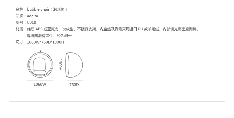 "芬兰家具设计大师艾洛.阿尼奥(Eero Aarnio)在德国品牌Adelta的代表作Bubble Chair(泡泡椅)。灵感来自于Ball Chair,但尺寸略小,而且椅子是以压克力制成,光线可以从四面八方透进。压克力加热充气,使它成为皂泡状,加入一个钢圈和椅垫即成。这样一组貌似轻巧的家具,但却能负重至少200公斤以上,由天花板垂链将Bubble吊起,宛如漂浮于空气中的泡泡一般!洁净面透明!带着科技感的椅子,又像置身于太空中,未来感十足。摆脱了椅子就是要放在地板上的刻板印象。最适合为摄影背景之用。坐在这把椅子上,即使身处一个拥挤的空间,也有点遗世独立的奇妙感觉。挪威一家电话公司在总公司入口大厅吊了几把这样的椅子,让客户可以在打行动电话时,有个宁静的空间。这件作品在1966年的科隆家具博览会上一举成名。