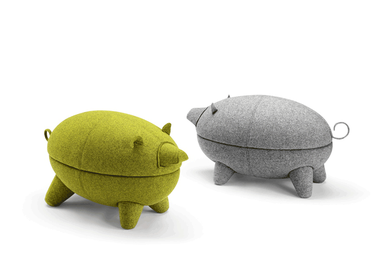 猪圆凳与现实中的动物“小猪”十分形似,设计灵感亦来源于此。基于猪圆凳简约的设计线条,其外表可做成油漆、皮革或布,颜色搭配更为丰富多彩,方便搭配各种场景和范围。猪圆凳同时还是一张多功能的圆凳,取去猪的上半部分,可作为茶几使用,其材质为玻璃钢,下隔层可以放置小物件和杂志等。