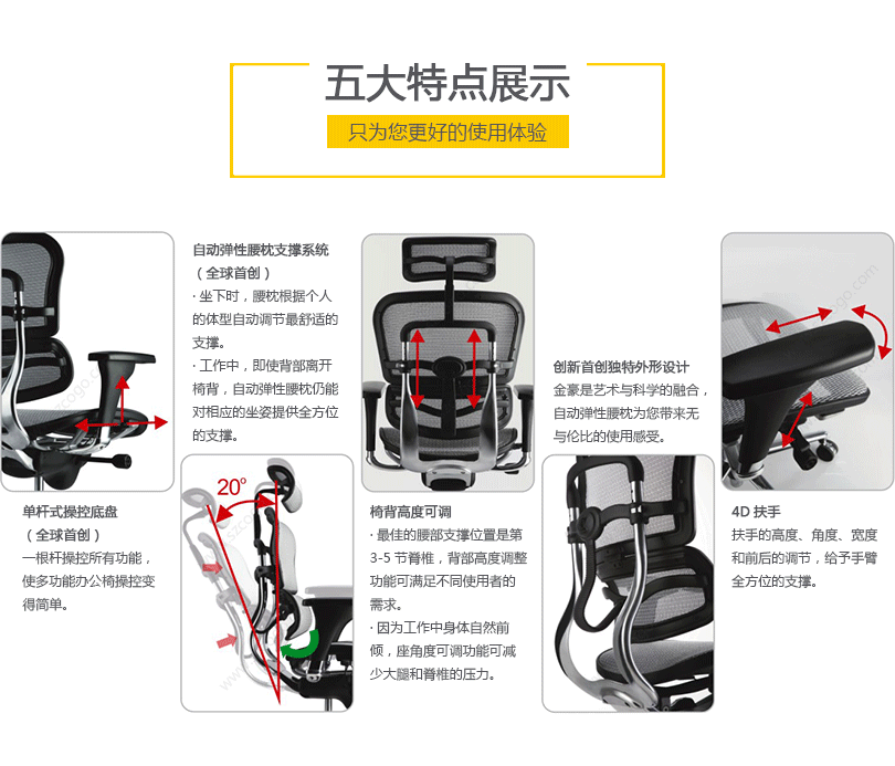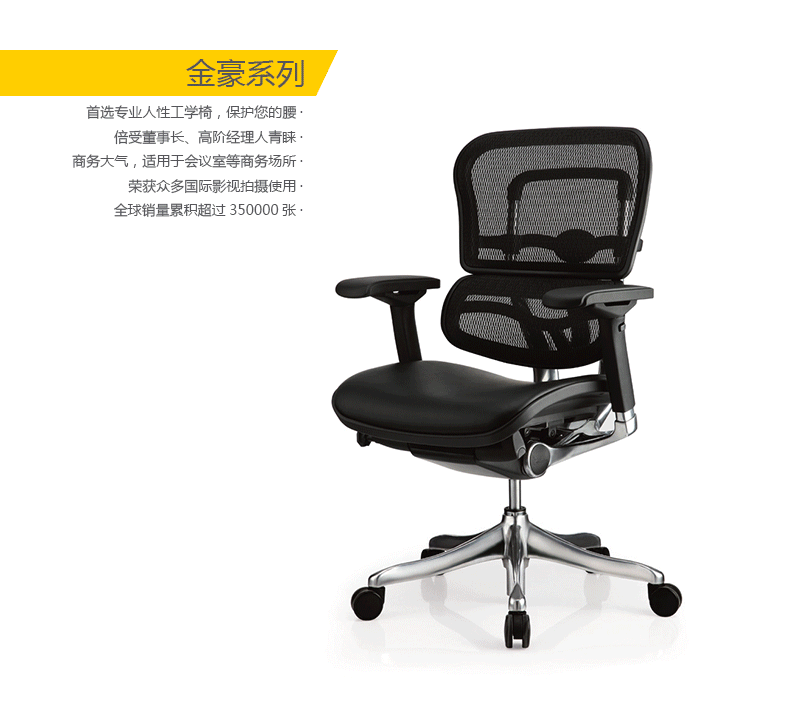 金豪办公椅是一款符合人体工学的全功能性办公椅,力求使用者能充分理解其人性化的设计及达到最舒适的调节。