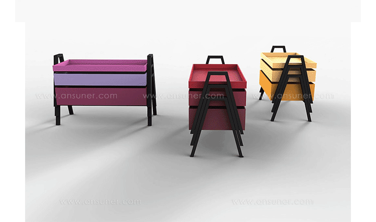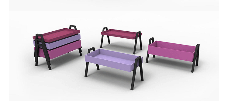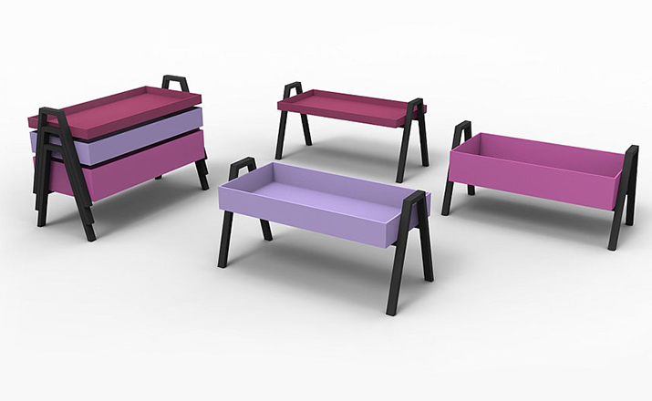 table composed of three containers of different heights in a barrel between them.legs in massello beech lacquered.plans in multilayer containers birch enamelled,set at each base.available in three variants of three colors each.