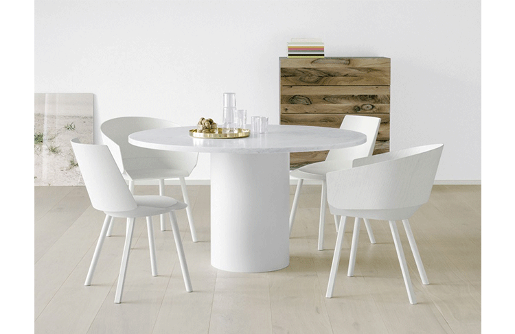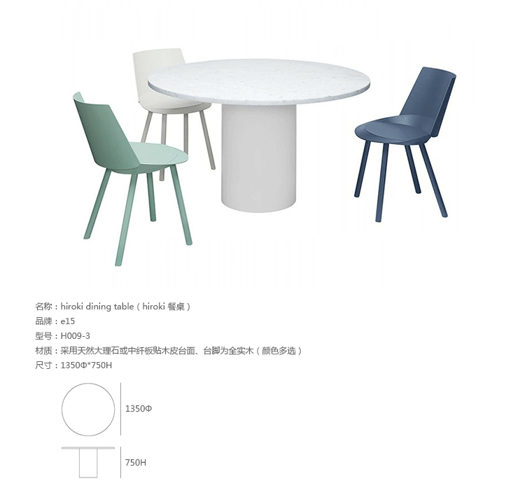Mainzer 的hiroki dining table(hiroki 餐桌),Philipp Mainzer的作品,设计基于他成功的金针菇边几系列,hiroki 餐桌更像金针菇边几的改良版,加大了台面宽度,减小了立柱直径,使之成为合适的餐桌。造型和选材都与金针菇边几一样,还扩大了新材料的运用,采用天然大理石或中纤板贴木皮台面、台脚为全实木(颜色多选)Hiroki 餐桌旁钢圆柱基础有十一种涂漆颜色可选,包括信号白、乌黑,交通灰色、淡蓝色、绿色、棕色,蜜黄色、影灰色、薄荷绿、海军蓝色、米色红色,火焰红等。