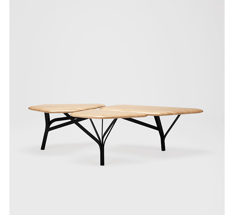 “波”是一个咖啡桌的灵感来自于石头松树波勒兹别墅的罗马。 金属结构繁殖的分支网络和支持三种木质表面。 表可以组合组合和成长这国内的树冠。