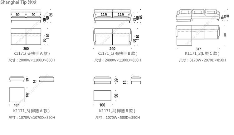 Shanghai Tip 沙发 系列尺寸/示意图