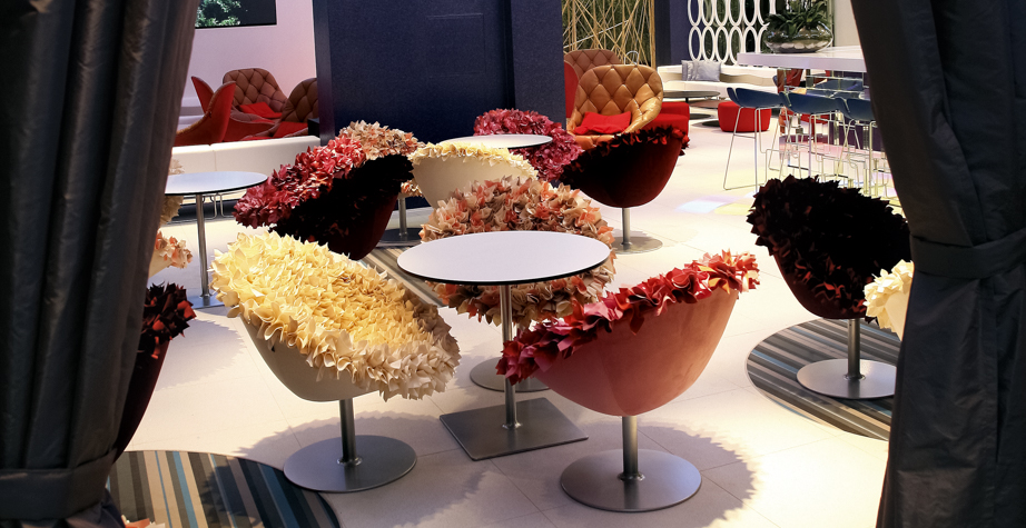 如纤细的镀铬金属茎上,绽放出一束花瓣,花瓣由一块块的织物组成,这些织物是用熟练的双手和无限的耐心一一折叠和缝制的。这是对精神美的一种赞颂,这种美存在于一个简单的重复动作中,揭示了视觉和真实形象之间的界限。花瓣的外皮包裹着鸡蛋形状的贝壳,直到所有的内部都被覆盖。梦幻的寓言,在工业设计的对象中颂扬的复杂的诗意转换。这把椅子让坐在上面的每个人都很开心,就像一束花一样。