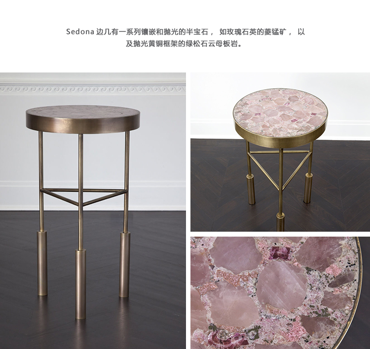 Sedona Side Table(塞多纳边几)有一系列镶嵌和抛光的半宝石,如玫瑰石英的菱锰矿,以及抛光黄铜框架的绿松石云母板岩。 每件作品都是独一无二。