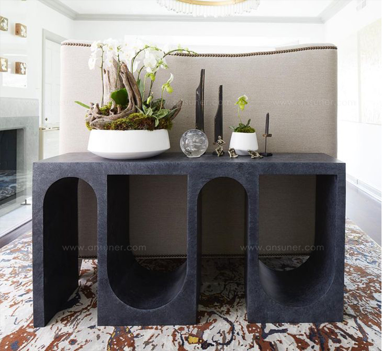 Roxbury玄关台采用实心树脂铸造,手工抹平石膏饰面,具有图形轮廓。 交替的拱形形成了这个独特的玄关台的形状,创造了空间几何和颜色的美丽调制。