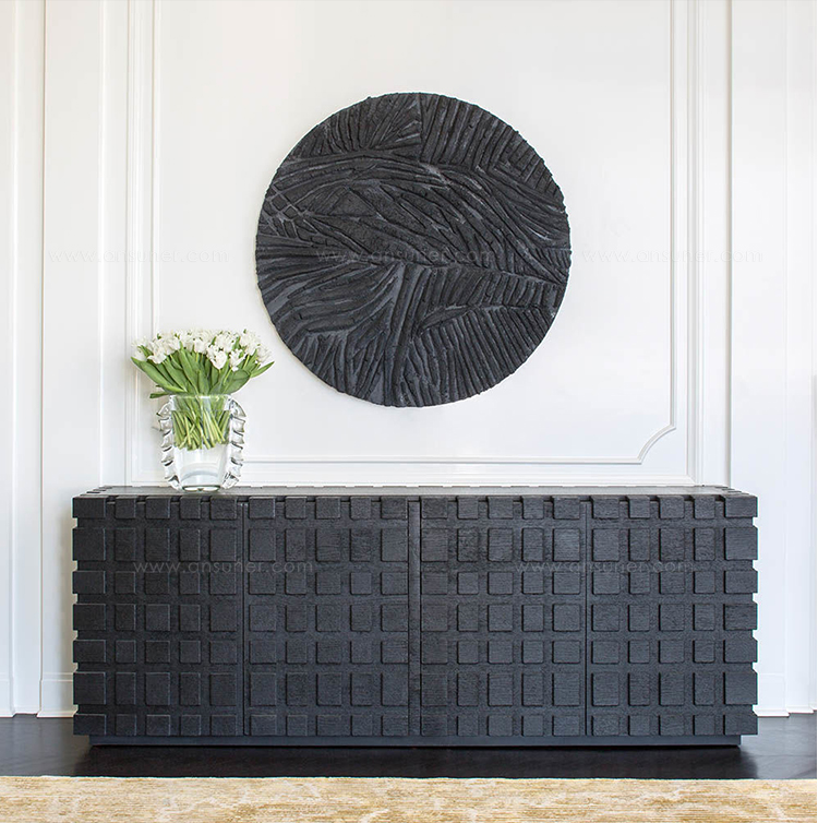 太平洋书柜的几何正面和侧面,由坚固的四分之一锯橡木雕刻而成,为这款巨大的低控制台带来了坚固的精致。 顶部镶嵌的金属丝拉丝大理石增加了整体的原始精致感。
