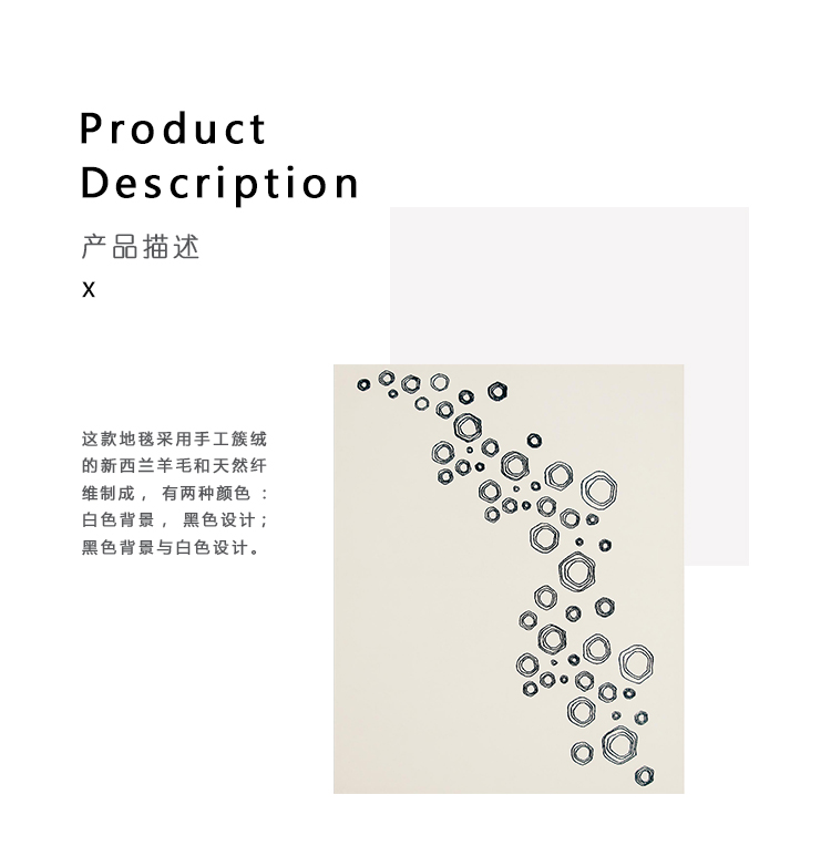 风格化的装饰元素是Cirkel地毯的主角,由Ilaria Marelli为Cappellini设计。 这款地毯采用手工簇绒的新西兰羊毛和天然纤维制成,有两种颜色:白色背景,黑色设计; 黑色背景与白色设计。