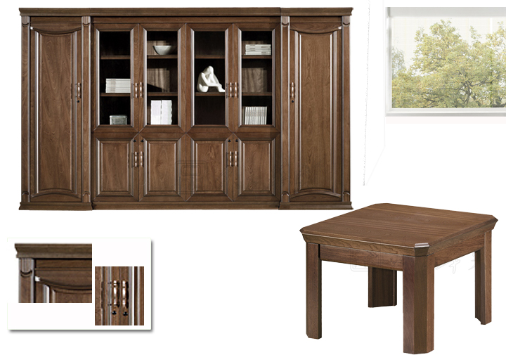 ※ 上图为系统配套小文件柜和方型茶几的细节展示,根据班台的风格和款式作风配置。(文件柜规格:3360W*4150D*2070H)