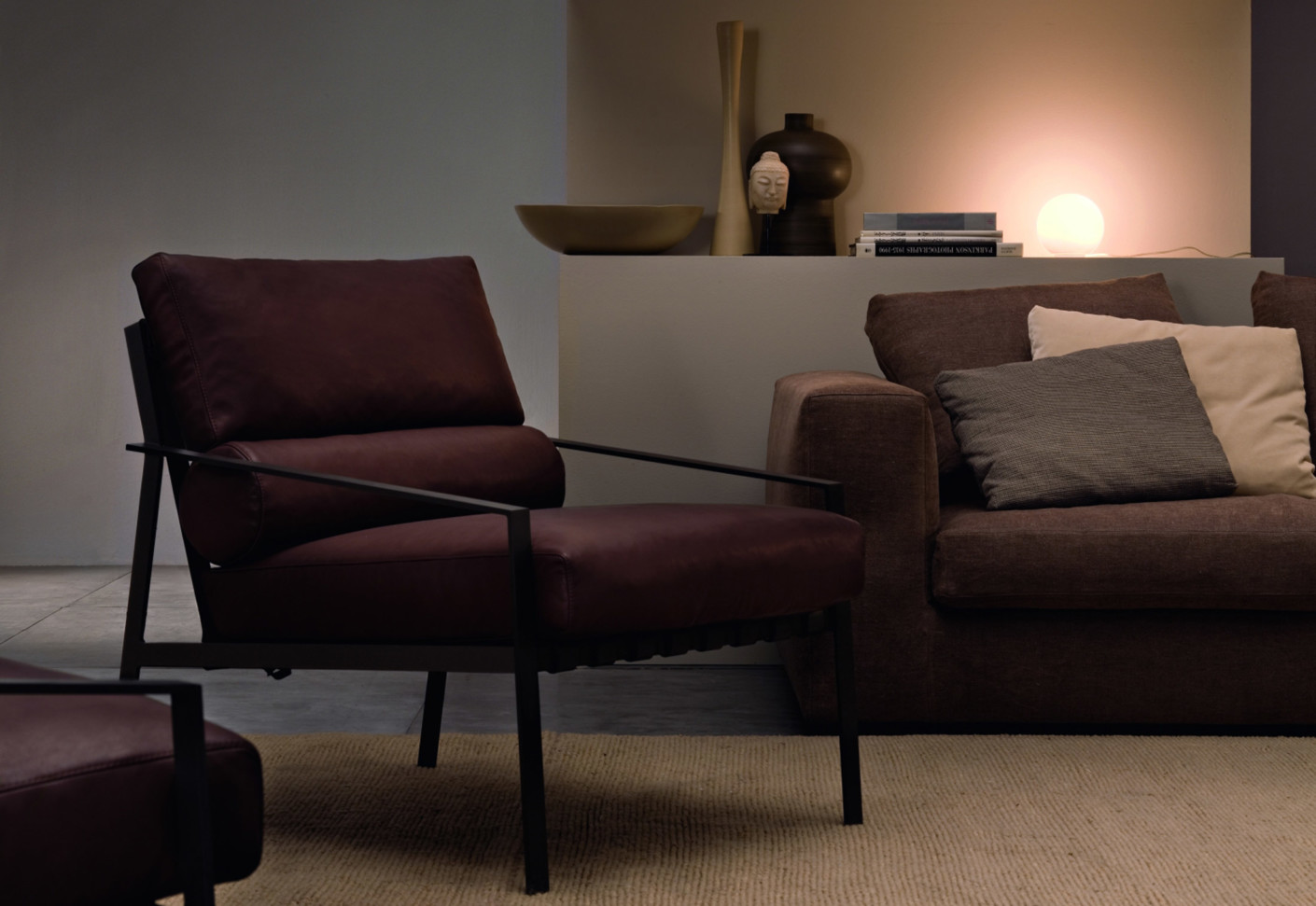 这是一种休闲椅,它的特点是用皮带支撑柔软舒适的垫子。其直线结构是高雅的现代生活方式的一种表达。这一结构有两种形式,一种是云母褐色的涂漆或黑色镀铬金属。