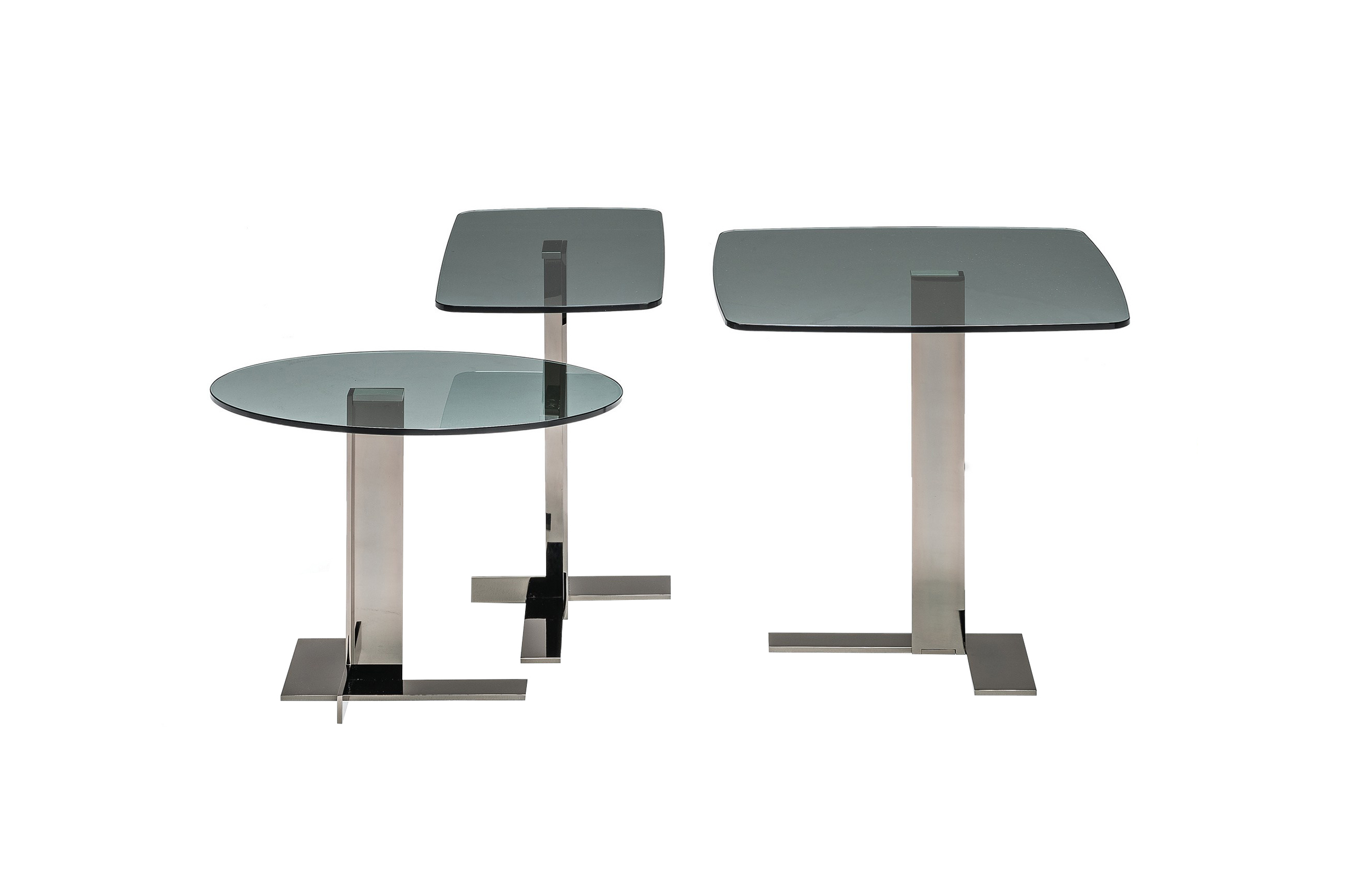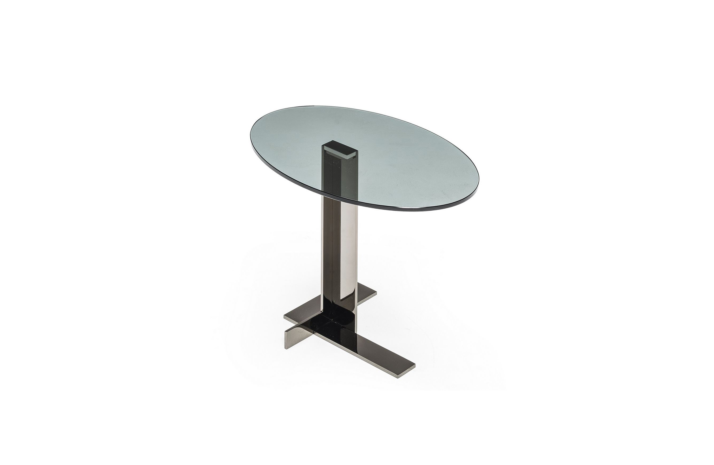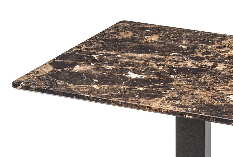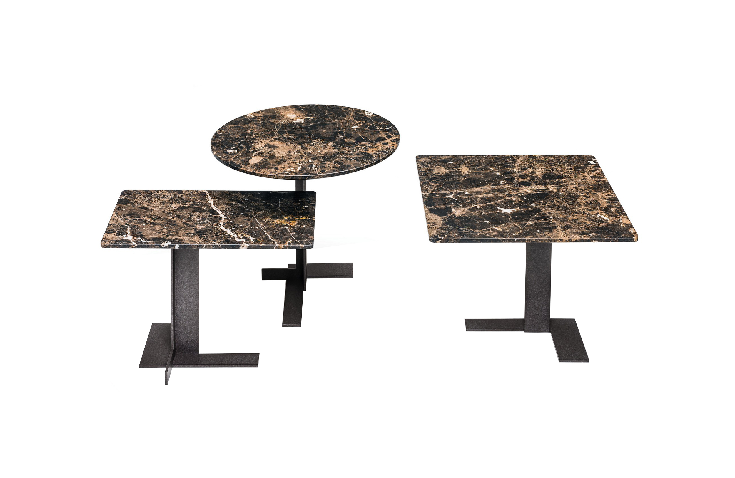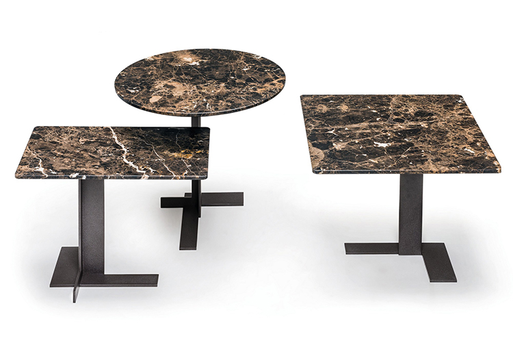 这些小桌子的外形很有吸引力:不同寻常的对比,柔软的和刚硬的组成部分共存,传达出和谐的、国际化的风格。它们可以像小行星一样被放置在房间里。有三种桌面可供选择:圆形、方形和长方形,桌面材质为大理石或砂岩,也有钝边的熏玻璃桌面。金属基材有云母棕,氧化灰或黑镍。