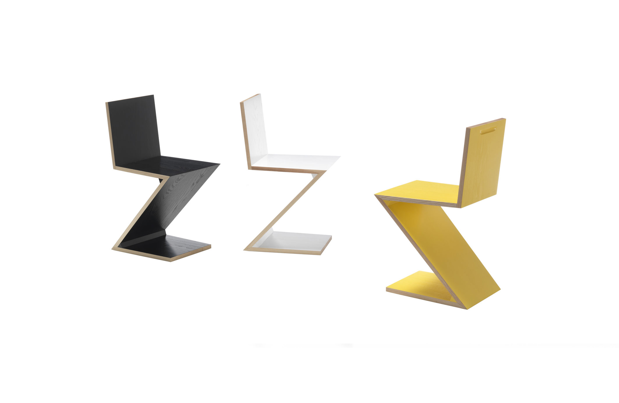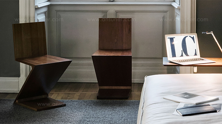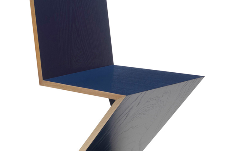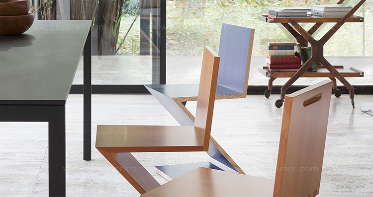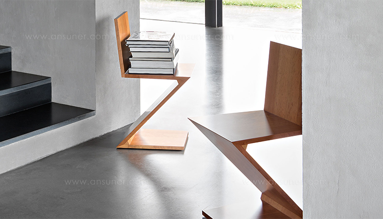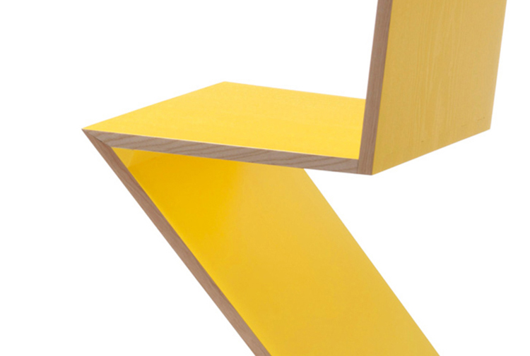 该款椅子采用天然樱桃木、天然白蜡木、或蓝色、红色、黄色、白色或黑色饰面的白蜡木制造,配有天然白蜡木边缘。靠背+座面+椅腿+椅脚。Rietveld 首次在利用新形状的场景中引入新类型椅子,归功于对角线的使用。锯齿状椅子拥有四个从顶部到底部依次优雅地弯曲的板,初看起来可能是不稳定的,但实际上非常四平八稳。