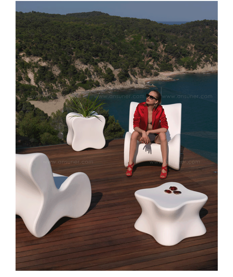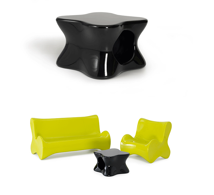Karim Rashid,当代最耀眼, 最多杰出作品的美国设计师,为西班牙VONDOM品牌设计了50个方案的作品,最终,它们归在6个系列。在这6个系列中,最突出的是DOUX系列, 一个器官造形的,友善的,色彩奔纷的。。。手绘出来的自然形状让你想触摸它,坐在它上面,享受它。 多功能性和未来感是这个系列最突出的元素。DOUX的桌子是多功能的 - 当躺下时,它是一张桌子,在中间的位置有一个孔,可以储存东西;当站立时,它变成了一个优雅的花器或一个可以放香 槟或酒的冰桶。