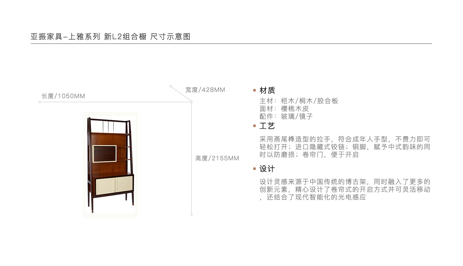 采用燕尾榫造型的拉手,符合成年人手型,不费力即可轻松打开;进口隐藏式铰链;铜脚,赋予中式韵味的同时以防磨损;卷帘门,便于开启。设计灵感来源于中国传统的博古架,同时融入了更多的创新元素,精心设计了卷帘式的开启方式并可灵活移动,还结合了现代智能化的光电感应。