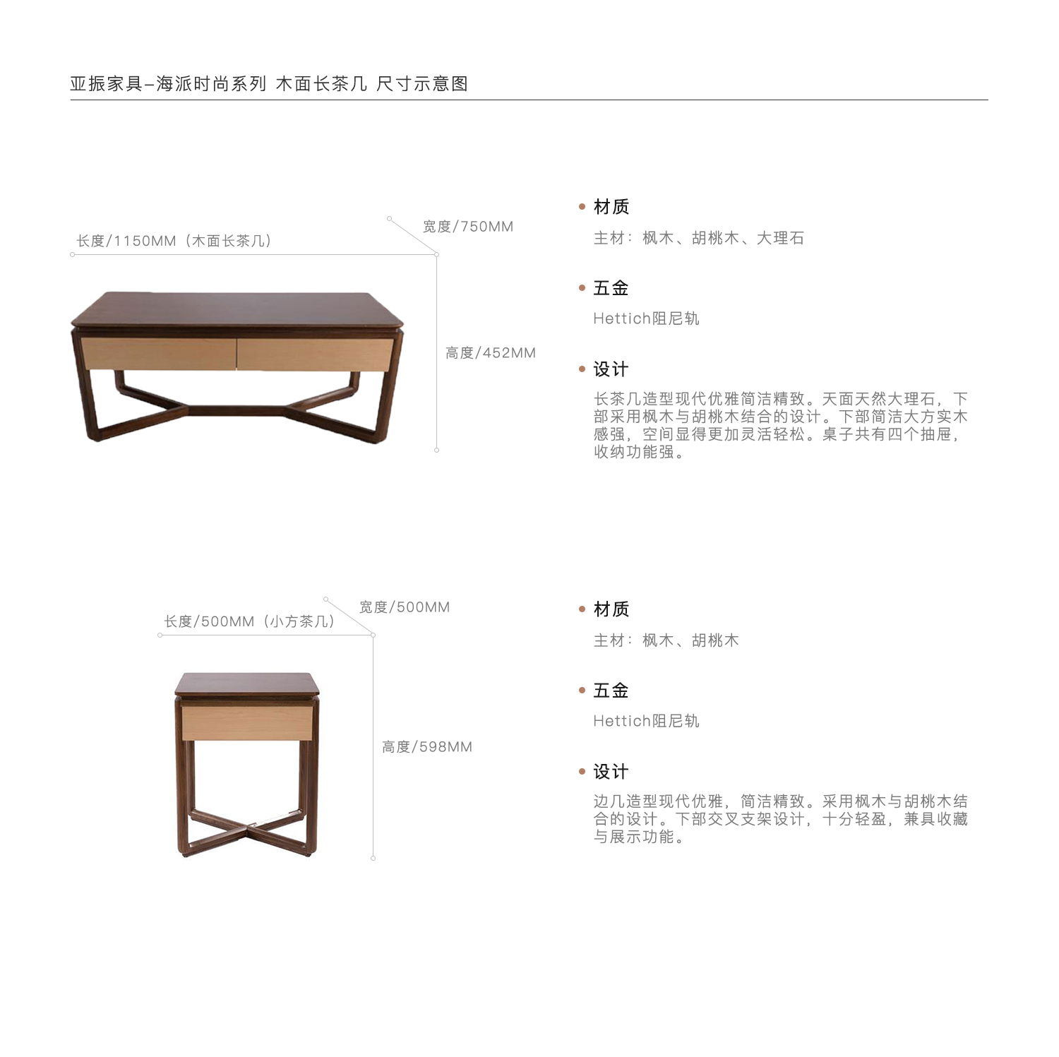 1.长茶几造型现代优雅简洁精致。天面天然大理石,下部采用枫木与胡桃木结合的设计。下部简洁大方实木感强,空间显得更加灵活轻松。桌子共有四个抽屉,收纳功能强。 2.边几造型现代优雅,简洁精致。采用枫木与胡桃木结合的设计。下部交叉支架设计,十分轻盈,兼具收藏与展示功能。