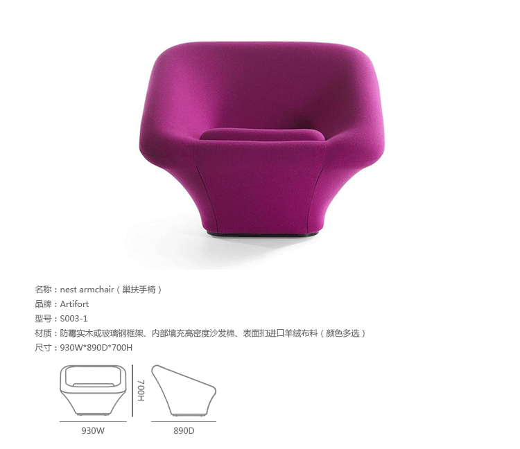 Artifort为其悠久的历史感到骄傲,在 2014 年,Artifort将Pierre Paulin经典的设计F564 和 C565重新带回家具舞台,我们称之为‘Nest’系列,Artifort深受喜爱系列之一。美丽流畅的线形,提供舒适的坐垫。它是有点复古,非常迷人,柔软,和亲切。‘Nest’造型就像一个蘑菇,制作采用防霉实木或玻璃钢框架、内部填充高密度沙发棉、表面扪进口羊绒布料(颜色多选)。