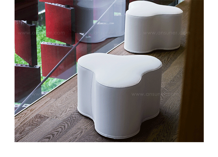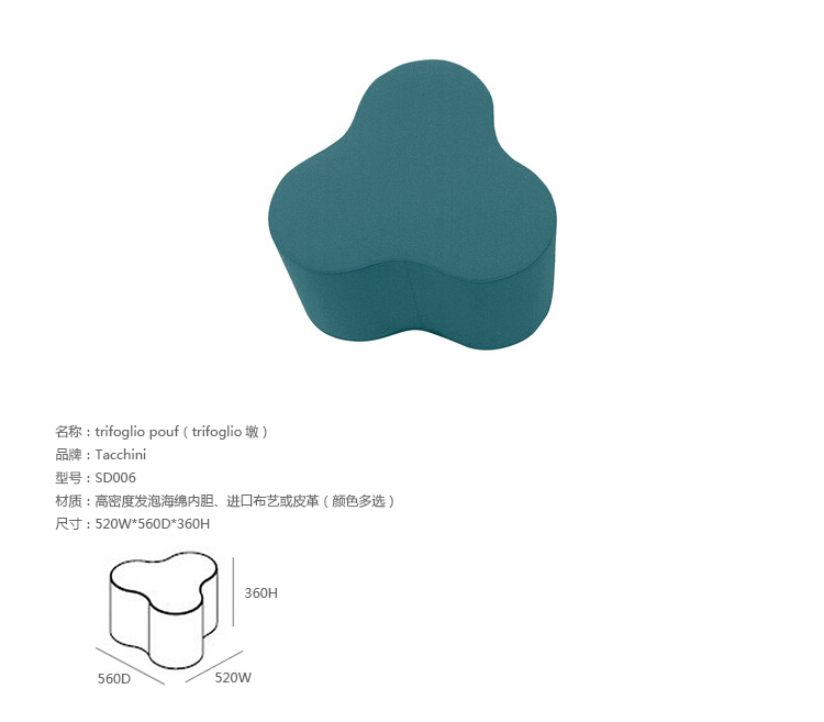 Trifoglio Pouf(trifoglio墩)意大利著名设计师Pietro Arosio的作品。造型就像三叶草叶子,清新自然,并且能根据您的想象力和创造力随意组合。做工精湛,缝线细腻,制作采用防霉实木内框架或玻璃钢内胆、高密度海绵、进口布艺或皮革(颜色可选)。即使不使用,单纯用来欣赏也是赏心悦目的。
