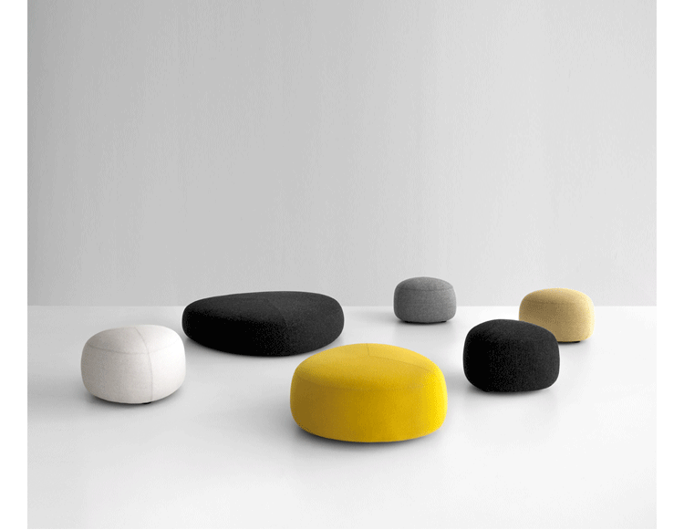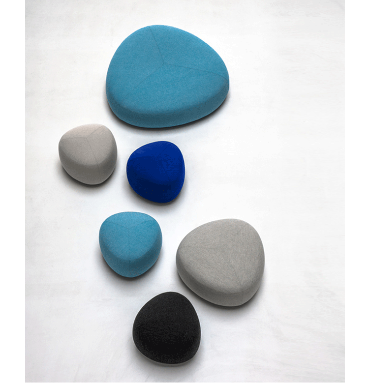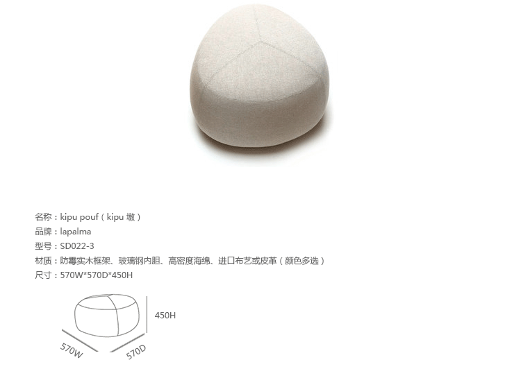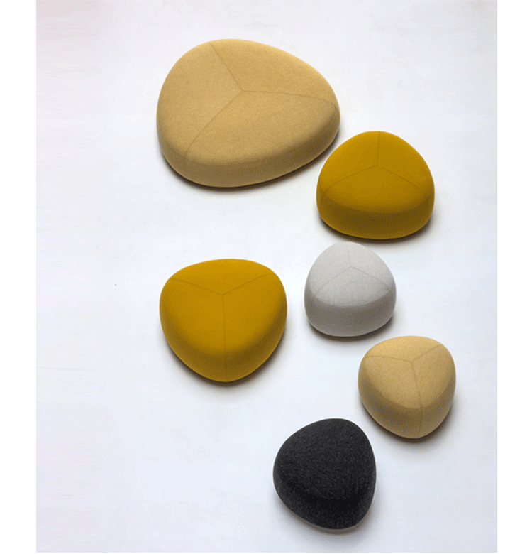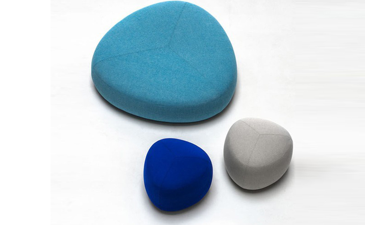 Kipu Pouf(Kipu 墩)的设计来着两个年轻的挪威设计师Torbjorn Anderssen和Espen Voll,灵感来自自然元素,被河水打磨的光滑鹅卵石,这就产生了三角形装卵石样的Kipu 墩。制作采用防霉实木框架、玻璃钢内胆、高密度海绵、高级布艺或皮革(颜色多选),软化所选择的颜色和面料,缝线细致的相交缝制,给人正式又休闲的感觉。其实用性非常广,可用于工作场所、非正式会议区、等候区、图书馆,也可以用在住宅项目,仿若舒适的"孤岛",可以不同高度、数量自由组合,即便不用来坐,单纯用来做艺术摆设都是非常高档的。