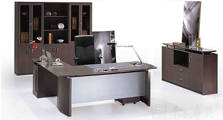 ※  独特而时尚,木制行政人员书桌主要由一张两侧微弧形的桌面以两旁湾间隔板组成,前面四分之三高度的面板配以哑面银色,而附加的桌面由掩门式或开放式的小文件柜以放置电脑主机。多元化的储物配置包括活动文件柜、掩门地柜或地柜由中抽屉、上层架及两边掩门构成,另有归一设计的组合柜包括下部掩门、玻璃门及上部开放层架,同款弧形设计的会议桌可选择附加线缆储存系统。