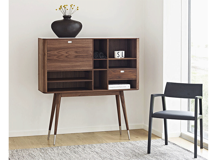 elroy retro upright credenza(埃尔罗伊复古立式书柜)是Kardiel公司制作的经典实木家具,1960年设计,是一件不朽的设。这个当代复古立式书柜有着高高的脚架,多个滑动抽柜和开放式抽屉。它允许“公开展示”和“隐蔽”所有类型的珍惜贵重物品的存储物。不锈钢装饰抽屉拉手和基部的尖尖的脚钉。