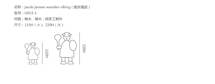 由于50年代的丹麦活跃着一股「斯堪地那维亚现代主义设计」风潮,延续低调简洁的风格并大量采用自然木材与传统工艺所迸出的美丽火花,设计大师Jacob Jensen也致力其中成为见证历史的大师之一。Jacob Jensen Wooden Viking(维京海盗)是经典的北欧形象,随着《加勒比海盗》系列电影的风靡,维京海盗在骁勇彪悍的传统形象里增加了俏皮、温暖、幽默的一面。这一组维京海盗形象为主题的北欧木雕设计,正是基于如此可爱的解读而做,摆在桌面上形成了饶有趣味的场景感,也是用来赠送的高档礼品。